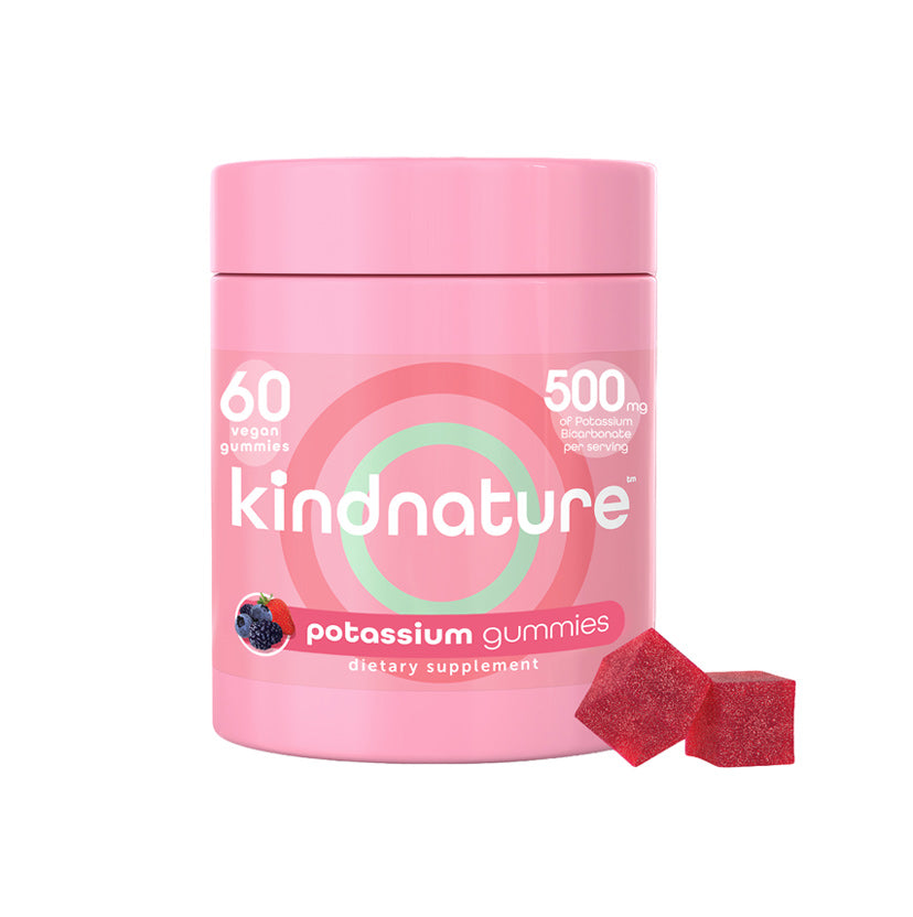 KINDNATURE delivers 500mg of Potassium Bicarbonate (195mg elemental potassium) in a chewable mixed-berry gummy. Not Potassium Citrate like everyone else — Bicarbonate. It's more alkalizing, gentler on digestion, and easier on your stomach.
